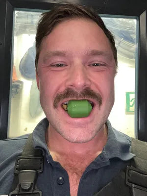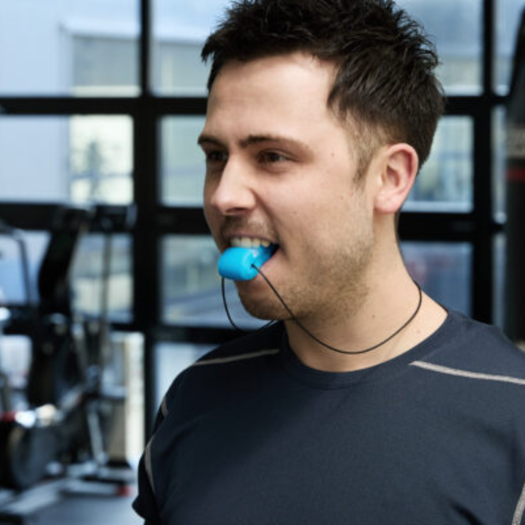 Plaats de trainer tussen je kiezen (niet je voortanden). Dit voorkomt schade en traint de juiste spiergroep: de masseter-spieren, verantwoordelijk voor je kaakvorm.