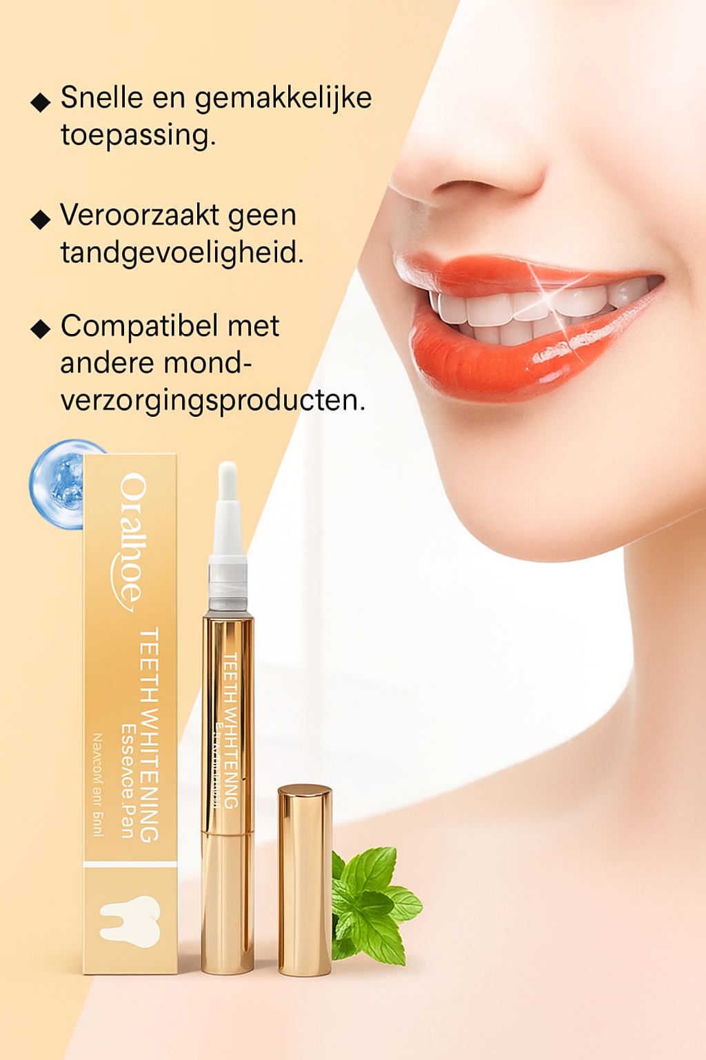 Houd je lippen ongeveer 30 seconden van je tanden af om de gel te laten drogen. Daarna kun je gewoon doorgaan met je dag — geen spoelen, geen vlekken, geen wachttijd.