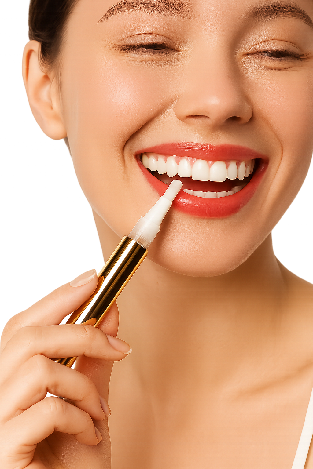 Draai aan de onderzijde van de pen tot er een kleine hoeveelheid gel zichtbaar is. Breng een dun laagje aan op de zichtbare tanden met een strijkende beweging. Focus op de tanden die je het meest laat zien tijdens het lachen.