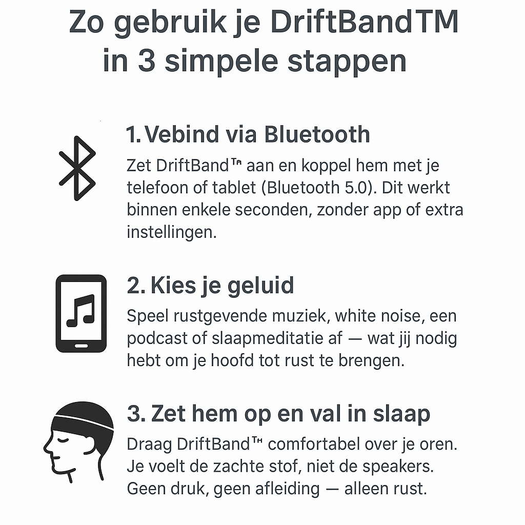 DriftBand™ combineert zachte stof met slimme technologie om je nachtrust eindelijk serieus te nemen. In de comfortabele hoofdband zitten ultradunne Bluetooth-speakers verwerkt die je nauwelijks voelt — zelfs niet als je op je zij ligt. Je verbindt eenvoudig via Bluetooth met je telefoon, kies jouw favoriete rustgevende geluiden (zoals white noise, muziek of een slaapmeditatie), en laat de rest aan DriftBand over.